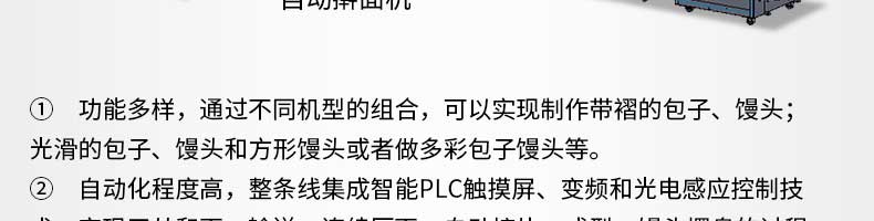 名稱智能包子饅頭生產(chǎn)線 電源380V 功率7.5KW 產(chǎn)量0-3600個/h 尺寸7590X2750X1510m 重量2100kg 規(guī)格10-100g/個 其他