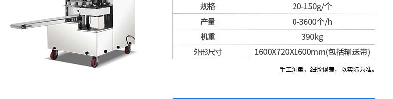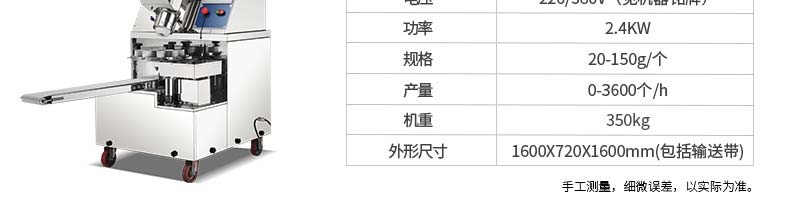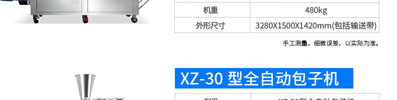 名稱XZ-960智能型包子機(jī) 電源220/380v 功率3kw 產(chǎn)量15-100g/個(gè) 尺寸1260*1200*1430mm(包括輸送帶) 重量340kg 規(guī)格 其他