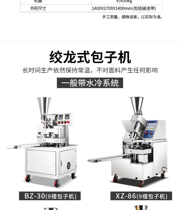 名稱XZ-190智能型卷面式包子機 電源220/380V(見機器銘牌) 功率2.22KW 產(chǎn)量0-3600個/h 尺寸1400X1700X1400mm(包括輸送帶) 重量約430kg 規(guī)格聯(lián)系銷售員 其他