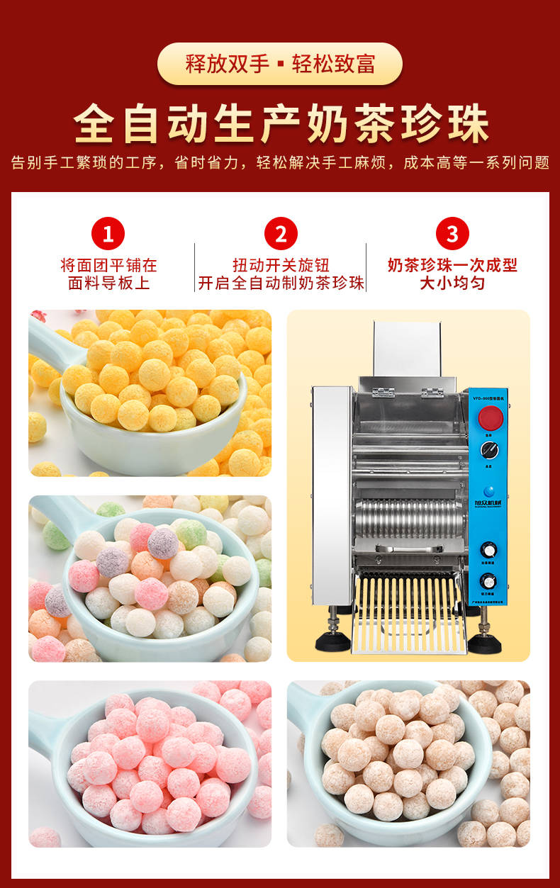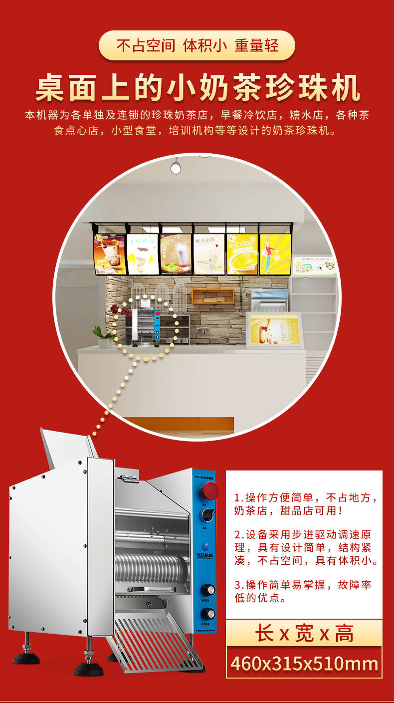 VFD-900珍珠奶茶機(jī),奶茶店、甜品店可用??缮a(chǎn)奶茶珍珠,果蔬圓子,無餡湯圓,水晶湯圓,各種芋圓。不占空間、體積小、重量輕,桌面上的小奶茶珍珠機(jī)。告別手工繁瑣的工序,省時(shí)省力,輕松解決手工麻煩,成本高等一系列問題