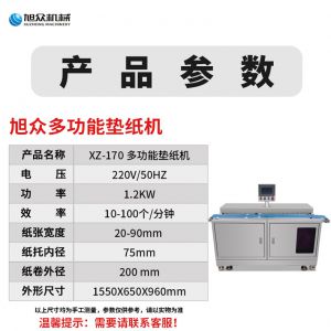 XZ-170多功能墊紙機(jī),適用于大規(guī)模生產(chǎn)多功能墊紙機(jī)適用于包子、饅頭、豆包等需要墊包紙的食。伺服控制、墊紙長度可調(diào)整。高效墊紙告別人工旭眾牌ⅩZ-170多功能墊紙機(jī)適用于規(guī)模生產(chǎn)的食品企業(yè)制作包子機(jī)、饅頭等食品的自動墊包紙設(shè)備。