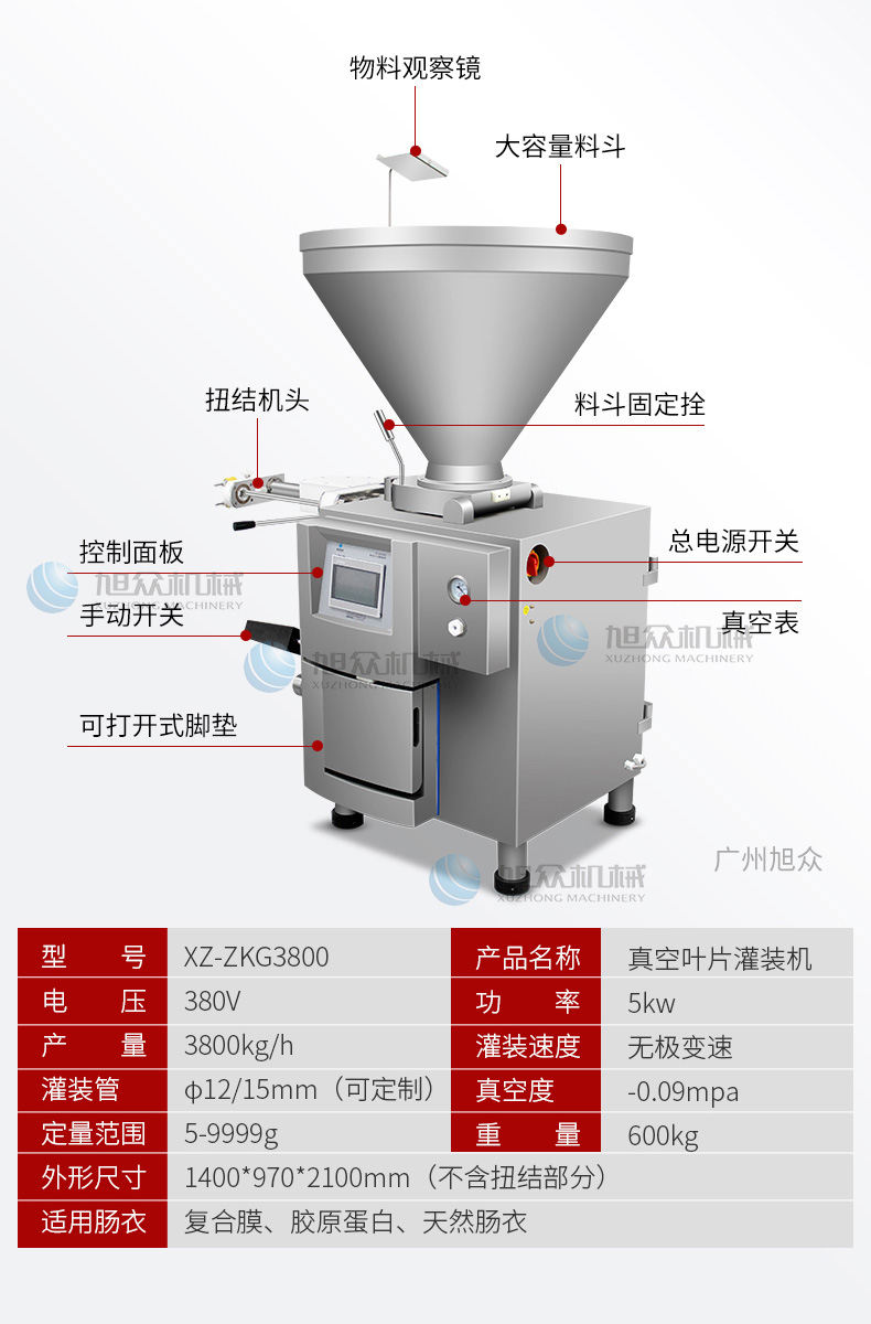 XZ-ZKG2800真空灌腸機(jī),真空葉片灌裝機(jī)連續(xù)作業(yè)加料后不需停機(jī),可灌肉粒&肉糜實(shí)用性強(qiáng)灌各種腸可做烤腸、親親腸、廣式臘腸、火鍋腸等連續(xù)灌制長(zhǎng)腸。