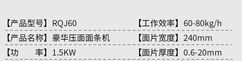 名稱RQJ60豪華型壓面面條機(jī) 電源咨詢銷售員 功率15KW 產(chǎn)量60-80kg/h 尺寸1000510X1180mm 重量11lkg 規(guī)格【機(jī)面片寬度】240mm 【面片厚度】0.6-20mm 其他