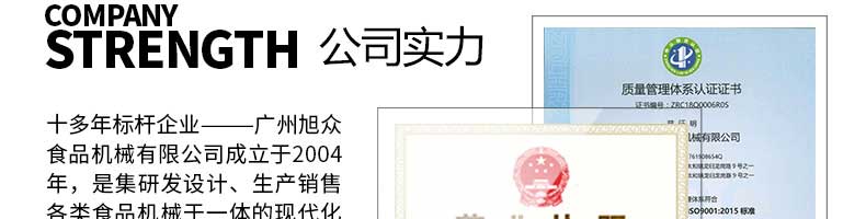 廣州旭眾食品機(jī)械有限公司是一家集科研開發(fā),生產(chǎn)設(shè)計(jì),營(yíng)銷服務(wù)為一體的現(xiàn)代化生產(chǎn)企業(yè)?,F(xiàn)代化生產(chǎn)車間,精湛制造技術(shù),所產(chǎn)機(jī)械歷經(jīng)市場(chǎng)重重考驗(yàn),不斷贏得海內(nèi)外客戶的贊譽(yù)。