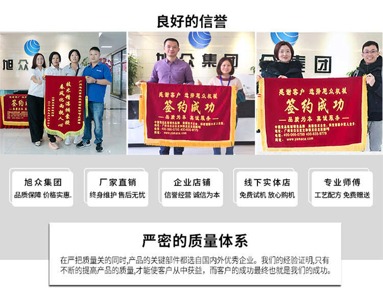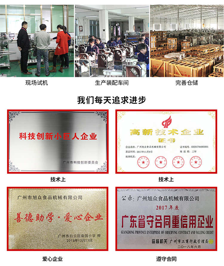 廣州旭眾食品機(jī)械有限公司是一家集科研開發(fā),生產(chǎn)設(shè)計,營銷服務(wù)為一體的現(xiàn)代化生產(chǎn)企業(yè)。現(xiàn)代化生產(chǎn)車間,精湛制造技術(shù),所產(chǎn)機(jī)械歷經(jīng)市場重重考驗,不斷贏得海內(nèi)外客戶的贊譽(yù)。