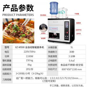 名稱(chēng)全自動(dòng)商用快速出面電動(dòng)素面濕面M500臺(tái)式制面機(jī)器 電源220V/50Hz 功率1100W 產(chǎn)量出面能力≥100份小時(shí)(≥20kgh) 尺寸800*450*1100mm 重量整機(jī)重150kg,占地面積0.4m 規(guī)格面粉容量8kg,出面速度20S/份 其他刀具規(guī)格出廠配一把面刀,規(guī)格可以選:1.5/1.9/2.5/3.75/10/33mm(可訂制)