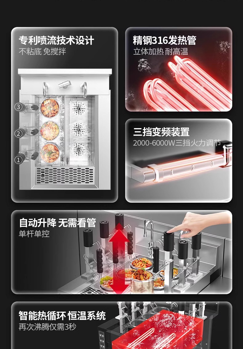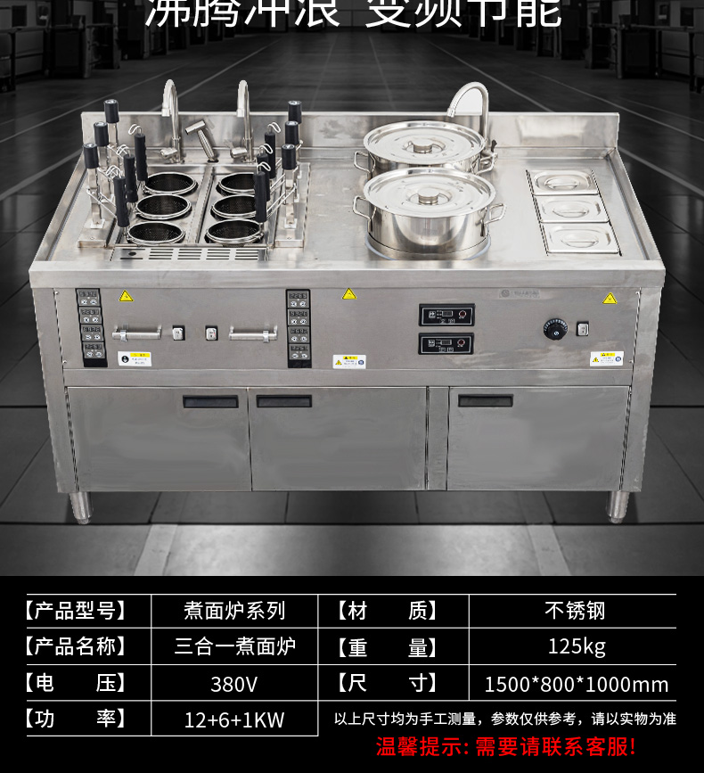 三合一煮面爐,全新升級,自動升降再次沸騰,僅需3秒。316精鋼加粗發(fā)熱管、升級噴流技術(shù)、低功耗變頻技術(shù)。煮面爐三合一升級,沸騰沖浪、變頻節(jié)能。
