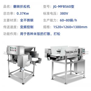 智能米飯扒松機-翻轉(zhuǎn)扒松機,主要結(jié)構(gòu):由不銹鋼機架、翻鍋機構(gòu)、扒松機構(gòu)輸送機構(gòu)和電氣自動系統(tǒng)等組成。適用對象:主要用于中央廚房、團膳、企事業(yè)單位食堂等