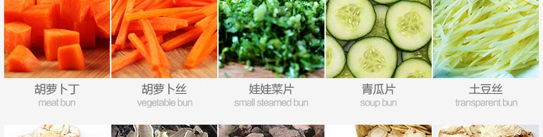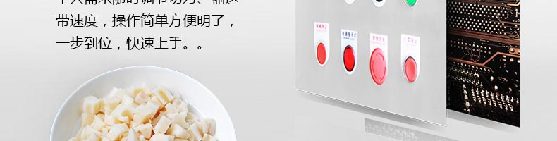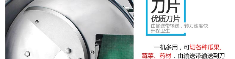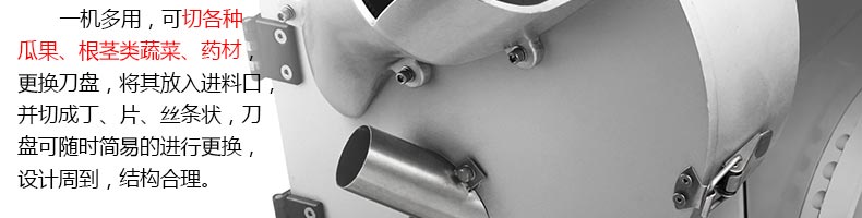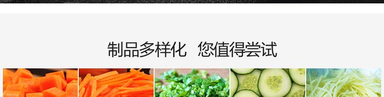 名稱XZ-680A多功能切菜機 電源220/380V(見機器銘牌) 功率1.3kw 產(chǎn)量300-1000千克/小時 尺寸1220*530*1280mm 重量140kg 規(guī)格標(biāo)配刀具尺寸:切絲:3mm,切片:3mm,切?。?0*10mm??蛇x的刀具尺寸:切絲:4、5、6mm 其他
