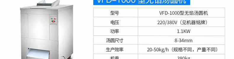 名稱VFD-1200無餡湯圓機(jī) 電源220/380V 功率0.55KW 產(chǎn)量50-100kg/h 尺寸1350*900*850mm 重量220kg 規(guī)格 其他