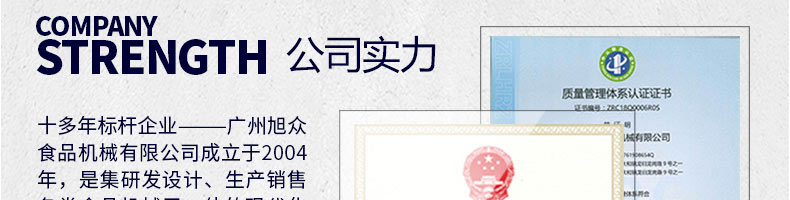 廣州旭眾食品機(jī)械有限公司是一家集科研開(kāi)發(fā),生產(chǎn)設(shè)計(jì),營(yíng)銷服務(wù)為一體的現(xiàn)代化生產(chǎn)企業(yè)。現(xiàn)代化生產(chǎn)車間,精湛制造技術(shù),所產(chǎn)機(jī)械歷經(jīng)市場(chǎng)重重考驗(yàn),不斷贏得海內(nèi)外客戶的贊譽(yù)。