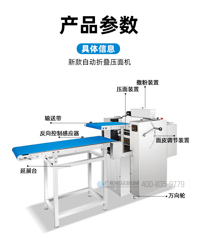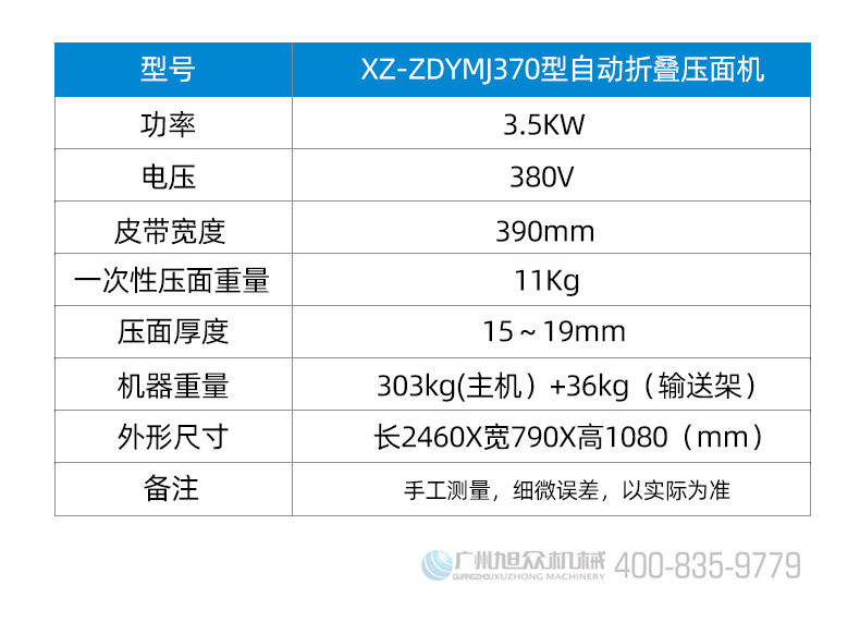 名稱XZ-ZDYMJ370型自動(dòng)折疊壓面機(jī) 電源380V 功率3.5KW 產(chǎn)量一次性壓面重量11kg 尺寸2460X寬790X高1080(mm) 重量機(jī)器重量303kg(主機(jī))+36kg(輸送架) 規(guī)格壓面厚度15~19mm 其他皮帶寬度390mm