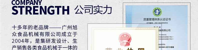 廣州旭眾食品機(jī)械有限公司是一家集科研開(kāi)發(fā),生產(chǎn)設(shè)計(jì),營(yíng)銷服務(wù)為一體的現(xiàn)代化生產(chǎn)企業(yè)。現(xiàn)代化生產(chǎn)車間,精湛制造技術(shù),所產(chǎn)機(jī)械歷經(jīng)市場(chǎng)重重考驗(yàn),不斷贏得海內(nèi)外客戶的贊譽(yù)。